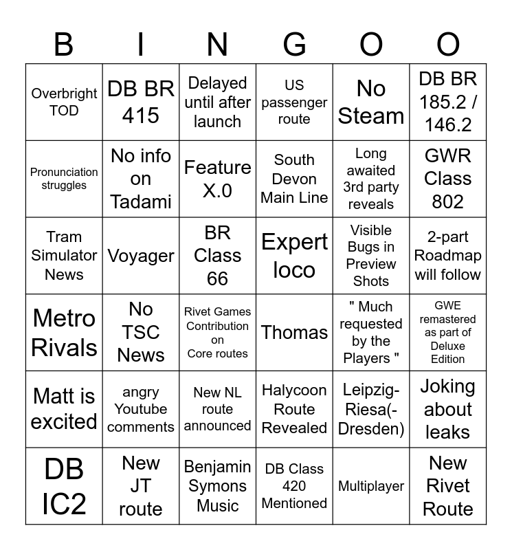 This bingo card has 36 words: Halycoon Route Revealed, New NL route announced, DB Class 420 Mentioned, Pronunciation struggles, Metro Rivals, Expert loco, No info on Tadami, Benjamin Symons Music, No Steam, Leipzig-Riesa(-Dresden), GWR Class 802, US passenger route, Joking about leaks, Voyager, South Devon Main Line, Overbright TOD, Matt is excited, Visible Bugs in Preview Shots, Tram Simulator News, Delayed until after launch, BR Class 66, No TSC News, Thomas, Rivet Games Contribution on Core routes, " Much requested by the Players ", DB BR 415, Long awaited 3rd party reveals, New JT route, Feature X.0, DB BR 185.2 / 146.2, New Rivet Route, DB IC2, GWE remastered as part of Deluxe Edition, 2-part Roadmap will follow, angry Youtube comments and Multiplayer.