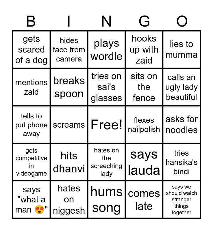 This bingo card has a free space and 24 words: hits dhanvi, hates on niggesh, tries on sai's glasses, says "what a man 😍", lies to mumma, gets scared of a dog, mentions zaid, hides face from camera, flexes nailpolish, hates on the screeching lady, sits on the fence, tells to put phone away, says lauda, tries hansika's bindi, breaks spoon, comes late, asks for noodles, plays wordle, calls an ugly lady beautiful, screams, says we should watch stranger things together, gets competitive in videogame, hooks up with zaid and hums song.
