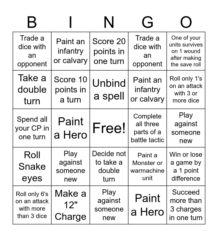 This bingo card has a free space and 24 words: Roll only 6's on an attack with more than 3 dice, Play against someone new, Unbind a spell, Paint a Hero, One of your units survives on 1 wound after making the save roll, Trade a dice with an opponent, Paint an infantry or calvary, Score 20 points in one turn, Complete all three parts of a battle tactic, Play against someone new, Spend all your CP in one turn, Score 10 points in a turn, Paint a Monster or warmachine unit, Win or lose a game by a 1 point difference, Take a double turn, Make a 12" Charge, Play against someone new, Trade a dice with an opponent, Roll only 1's on an attack with 3 or more dice, Roll Snake eyes, Paint a Hero, Decide not to take a double turn, Paint an infantry or calvary and Succeed more than 3 charges in one turn.