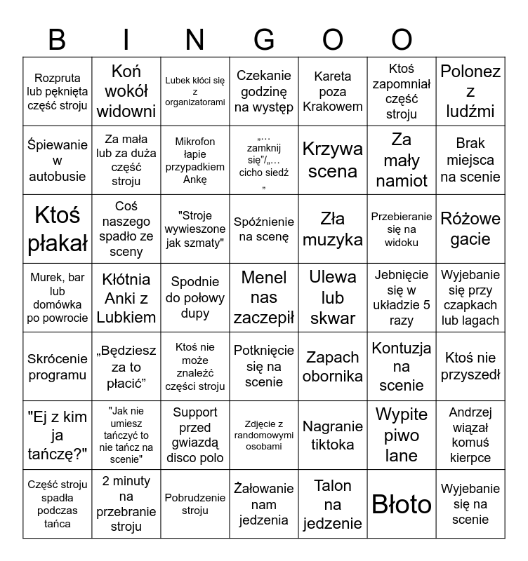 This bingo card has 49 words: Wypite piwo lane, Za mały namiot, Talon na jedzenie, Kłótnia Anki z Lubkiem, "Stroje wywieszone jak szmaty", Wyjebanie się przy czapkach lub lagach, Koń wokół widowni, Pobrudzenie stroju, Ktoś zapomniał część stroju, Potknięcie się na scenie, Polonez z ludźmi, Czekanie godzinę na występ, Przebieranie się na widoku, Zła muzyka, "Jak nie umiesz tańczyć to nie tańcz na scenie", Jebnięcie się w układzie 5 razy, Śpiewanie w autobusie, Brak miejsca na scenie, Andrzej wiązał komuś kierpce, Kareta poza Krakowem, Krzywa scena, Spodnie do połowy dupy, Rozpruta lub pęknięta część stroju, Za mała lub za duża część stroju, Część stroju spadła podczas tańca, Mikrofon łapie przypadkiem Ankę, Różowe gacie, 2 minuty na przebranie stroju, Spóźnienie na scenę, Coś naszego spadło ze sceny, Wyjebanie się na scenie, Ulewa lub skwar, "Ej z kim ja tańczę?", Support przed gwiazdą disco polo, Murek, bar lub domówka po powrocie, Zapach obornika, Kontuzja na scenie, Ktoś nie przyszedł, Ktoś płakał, Ktoś nie może znaleźć części stroju, Zdjęcie z randomowymi osobami, Skrócenie programu, Menel nas zaczepił, Żałowanie nam jedzenia, „… zamknij się”/„…cicho siedź „, Lubek kłóci się z organizatorami, Nagranie tiktoka, „Będziesz za to płacić” and Błoto.