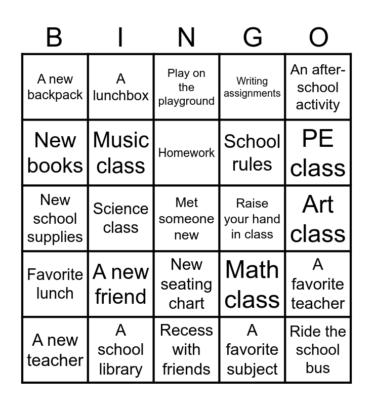 This bingo card has a free space and 24 words: A new teacher, A new friend, Homework, A favorite subject, An after-school activity, A new backpack, A lunchbox, Play on the playground, Raise your hand in class, Art class, New school supplies, Music class, Math class, A favorite teacher, New books, A school library, Recess with friends, Writing assignments, PE class, Favorite lunch, Science class, New seating chart, School rules and Ride the school bus.