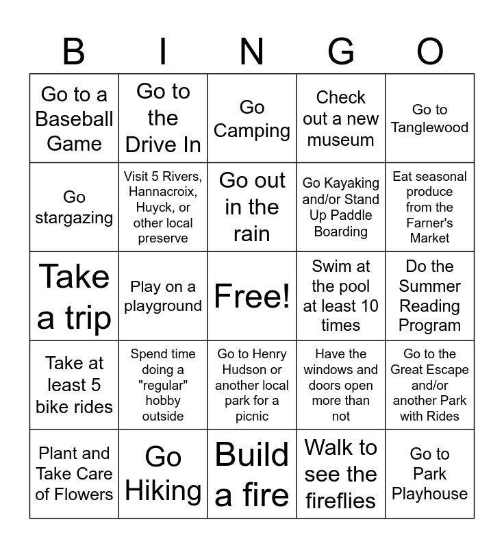 This bingo card has a free space and 24 words: Spend time doing a "regular" hobby outside, Go Hiking, Go out in the rain, Plant and Take Care of Flowers, Go to Tanglewood, Go to a Baseball Game, Go stargazing, Go to the Drive In, Swim at the pool at least 10 times, Go to Henry Hudson or another local park for a picnic, Go Kayaking and/or Stand Up Paddle Boarding, Take a trip, Have the windows and doors open more than not, Go to the Great Escape and/or another Park with Rides, Visit 5 Rivers, Hannacroix, Huyck, or other local preserve, Walk to see the fireflies, Do the Summer Reading Program, Go Camping, Eat seasonal produce from the Farner's Market, Play on a playground, Go to Park Playhouse, Take at least 5 bike rides, Check out a new museum and Build a fire.