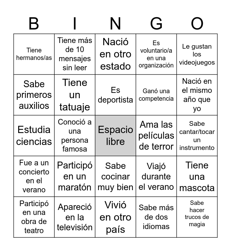 This bingo card has a free space and 24 words: Participó en un maratón, Apareció en la televisión, Es deportista, Participó en una obra de teatro, Le gustan los videojuegos, Tiene hermanos/as, Sabe primeros auxilios, Tiene más de 10 mensajes sin leer, Ama las películas de terror, Sabe cocinar muy bien, Ganó una competencia, Estudia ciencias, Viajó durante el verano, Tiene una mascota, Tiene un tatuaje, Sabe más de dos idiomas, Sabe cantar/tocar un instrumento, Nació en otro estado, Nació en el mismo año que yo, Conoció a una persona famosa, Sabe hacer trucos de magia, Fue a un concierto en el verano, Es voluntario/a en una organización and Vivió en otro país.