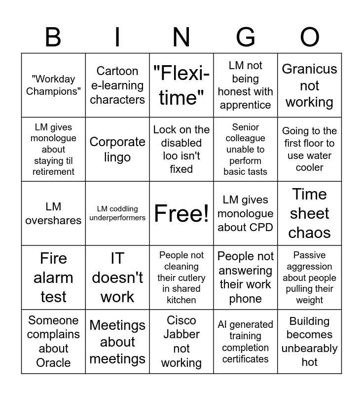 This bingo card has a free space and 24 words: IT doesn't work, Meetings about meetings, Lock on the disabled loo isn't fixed, Someone complains about Oracle, Granicus not working, "Workday Champions", LM gives monologue about staying til retirement, Cartoon e-learning characters, LM gives monologue about CPD, People not cleaning their cutlery in shared kitchen, Senior colleague unable to perform basic tasts, LM overshares, People not answering their work phone, Passive aggression about people pulling their weight, Corporate lingo, AI generated training completion certificates, Time sheet chaos, "Flexi-time", Going to the first floor to use water cooler, LM coddling underperformers, Building becomes unbearably hot, Fire alarm test, LM not being honest with apprentice and Cisco Jabber not working.