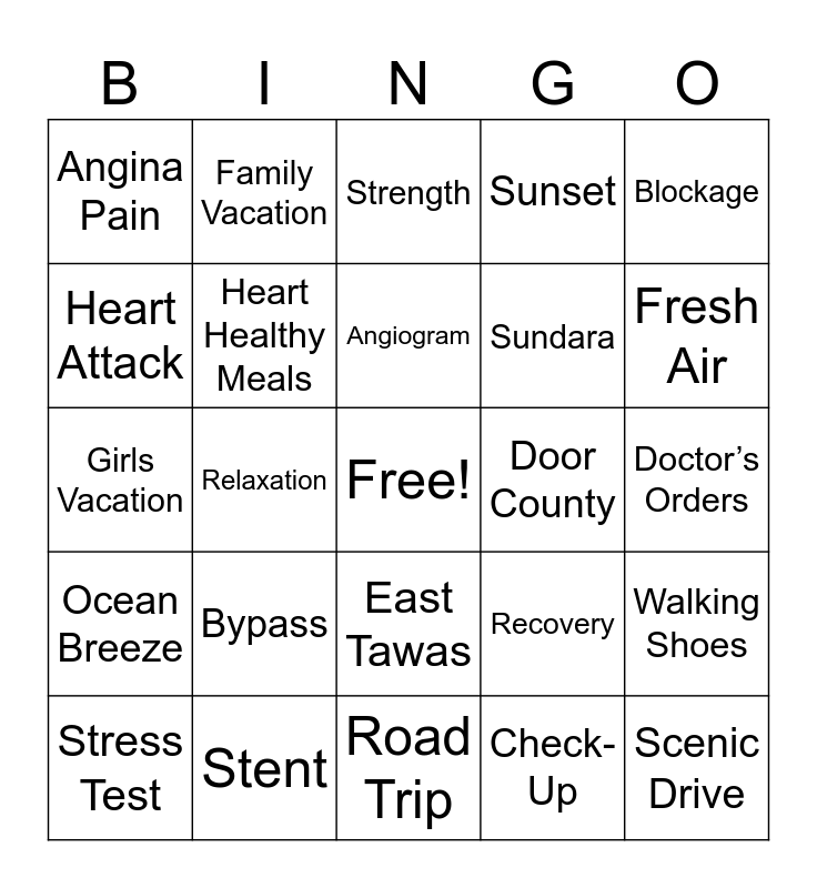 This bingo card has a free space and 24 words: Bypass, Stent, Angiogram, Stress Test, Blockage, Angina Pain, Heart Attack, Family Vacation, Door County, East Tawas, Sundara, Girls Vacation, Recovery, Walking Shoes, Heart Healthy Meals, Check-Up, Doctor’s Orders, Strength, Fresh Air, Relaxation, Scenic Drive, Ocean Breeze, Sunset and Road Trip.