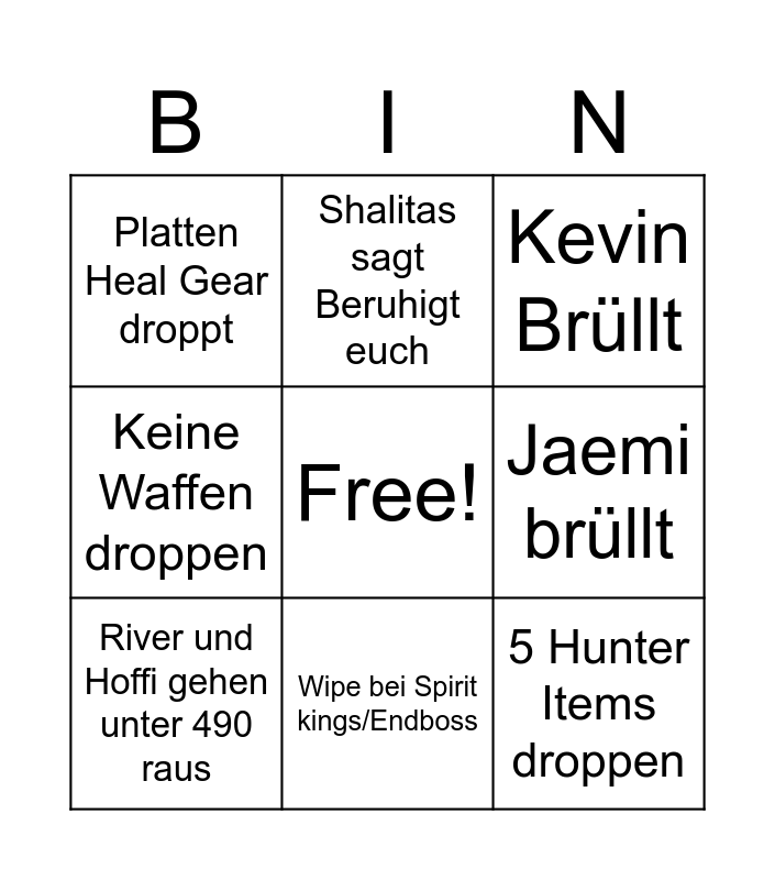 This bingo card has a free space and 8 words: Jaemi brüllt, Kevin Brüllt, Shalitas sagt Beruhigt euch, River und Hoffi gehen unter 490 raus, Platten Heal Gear droppt, 5 Hunter Items droppen, Keine Waffen droppen and Wipe bei Spirit kings/Endboss.