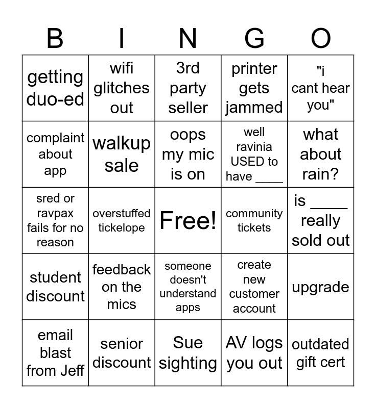 This bingo card has a free space and 37 words: vip wristbands/ backstage passes, "we dont have the artist list yet", "i'm on the list" "which list", walkup sale, upgrade, feedback on the mics, oops my mic is on, ticket reprint, "i cant hear you", customer steals pen, overstuffed tickelope, printer gets jammed, outdated gift cert, is ____ really sold out, complaint about app, student discount, military discount, 3rd party seller, someone doesn't understand apps, community tickets, getting duo-ed, what about rain?, email blast from Jeff, Sue sighting, TCV, AV logs you out, wifi glitches out, not my circus, not my monkeys, lost and found, $1000+ transaction, computer updates, senior discount, sred or ravpax fails for no reason, ticket donation, create new customer account, well ravinia USED to have ____ and when does ___ go on.