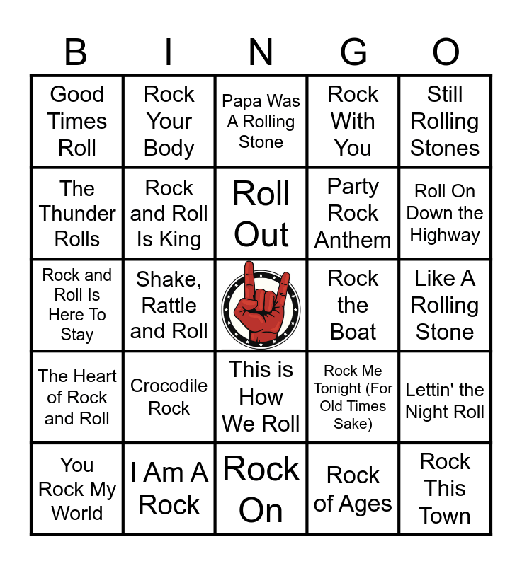This bingo card has a free space and 64 words: Rock and roll all Nite, It's Still Rock and Roll To Me, Rock and Roll Heaven, Lettin' the Night Roll, Rolling With the Flow, Rolling in the Deep, Rock Your Body, Rollin', Roll Out, Roll With the Changes, This is How We Roll, Old Time Rock and Roll, Like A Rolling Stone, Still Rolling Stones, I Love Rock and Roll, The Thunder Rolls, Shake, Rattle and Roll, Good Times Roll, Jailhouse Rock, Party Rock Anthem, Crocodile Rock, The Heart of Rock and Roll, Rock With You, Roll Over Beethoven, Rock the Casbah, Rock You Like A Hurricane, Rockabye Baby, Let's Get Rocked, R.O.C.K. in the USA, Detroit Rock City, Don't Rock the Jukebox, Rock Steady, We Will Rock You, Rock Lobster, Roll On Down the Highway, You Rock My World, Loves Me Like A Rock, Rock of Ages, Rock-a-Hula Baby, Rock and Roll Is King, Rock and Roll Is Here To Stay, Rock the Boat, Rock and Roll Music, Rock Me Gently, Rock and Roll Fantasy, Rock This Town, I Am A Rock, Rock My World (Little Country Girl), Rock Me Tonight (For Old Times Sake), Rock of Life, Rock Me Tonight, Rock Me Amadeus, Rock On, Rock Wit'cha, Roll With It, Rock Around the Clock, Papa Was A Rolling Stone, Roll On (Eighteen Wheeler), Rockin' Around the Christmas Tree, Rock'n Me, Jingle Bell Rock, I Wanna Rock, Rockin' Robin and That's Rock 'N' Roll.