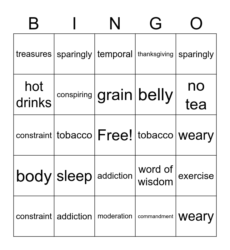 ⚠ This card has duplicate items: principle (2), addiction (2), moderation (2), body (2), spirit (2), promise (2), conspiring (2), forewarn (2), belly (2), prudence (2), thanksgiving (2), beast (2), hot drinks (2), strong drink (2), health (2), treasures (2), weary (2), sparingly (2), herb (2), grain (2), tobacco (2), temporal (2), constraint (2), commandment (2), sleep (2), no coffee (2), no tea (2), word of wisdom (2), exercise (2), healthy (2), fruits (2)