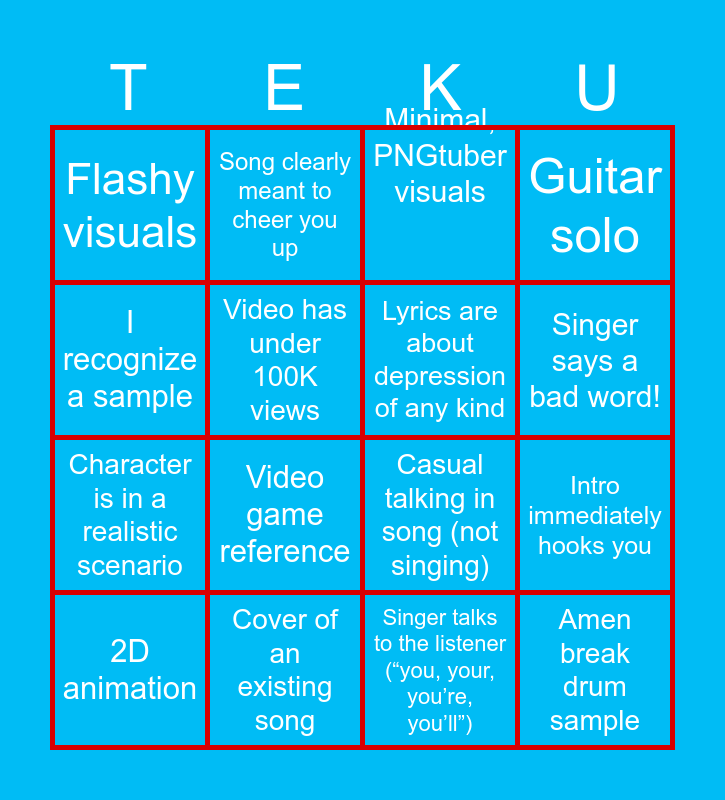 This bingo card has 35 words: Hatsune Miku appearance in a non-Miku song, Song shifts up a semitone, Character is in a dark void, Lyrics are about depression of any kind, Quiet, relaxed verse, Guitar solo, Video has under 100K views, Fully Japanese title or description, Singer says a bad word!, Chorus is replayed 4 or more times total, Casual talking in song (not singing), I recognize a sample, Overly joyful music, Video has over 1M views, Flashy visuals, Cover of an existing song, Long intro, Intro immediately hooks you, Amen break drum sample, 2D animation, 3D animation, Video is over 10 years old, Miku sings, Teto sings, Minimal, PNGtuber visuals, Video game reference, Mood suddenly changes completely, Bed squeaking, Character is in a realistic scenario, Singer talks to the listener (“you, your, you’re, you’ll”), Song abruptly cuts off, Hatsune Miku is in pain, Akita Neru cameo, Song clearly meant to cheer you up and Drum & bass section.