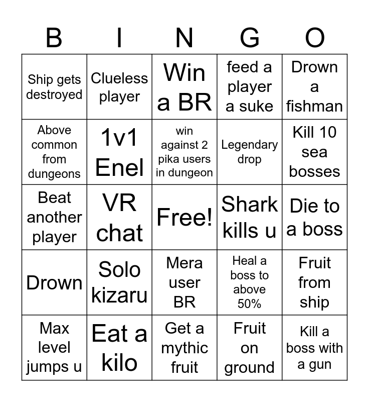 This bingo card has a free space and 28 words: Fruit from ship, Pls fruit, Legendary drop, Fruit on ground, Above common from dungeons, Win a BR, Clueless player, Drown, Shark kills u, Max level jumps u, Beat another player, feed a player a suke, Eat a kilo, Get a mythic fruit, Kill 10 sea bosses, Get every drop from WB, Solo kizaru, 1v1 Enel, win against 2 pika users in dungeon, Mera user BR, Ship gets destroyed, ND, Kill a boss with a gun, VR chat, Die to a boss, Heal a boss to above 50%, Drown a fishman and Kill eachother 3 times.