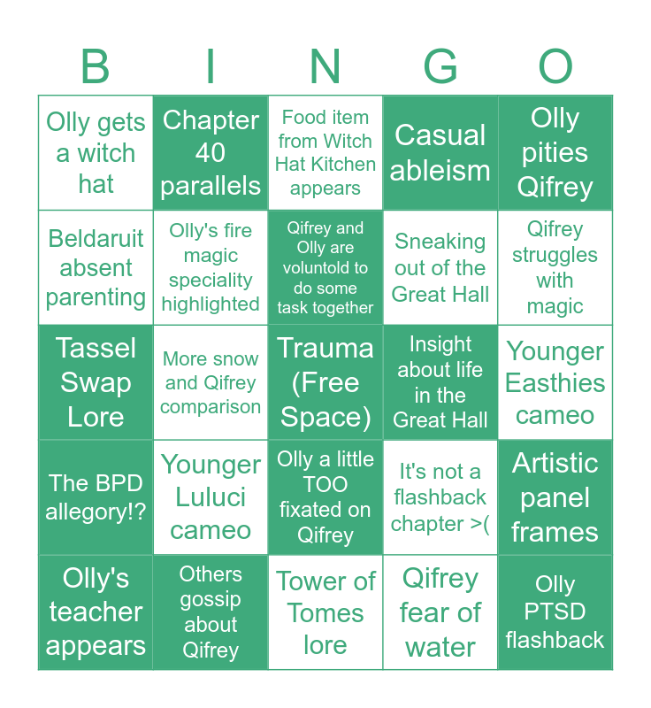 This bingo card has a free space and 24 words: Olly's teacher appears, Younger Luluci cameo, Qifrey and Olly are voluntold to do some task together, Qifrey fear of water, Olly pities Qifrey, Olly gets a witch hat, Chapter 40 parallels, Food item from Witch Hat Kitchen appears, Insight about life in the Great Hall, Younger Easthies cameo, Tassel Swap Lore, Olly's fire magic speciality highlighted, It's not a flashback chapter >(, Artistic panel frames, Beldaruit absent parenting, Others gossip about Qifrey, Tower of Tomes lore, Casual ableism, Qifrey struggles with magic, The BPD allegory!?, More snow and Qifrey comparison, Olly a little TOO fixated on Qifrey, Sneaking out of the Great Hall and Olly PTSD flashback.