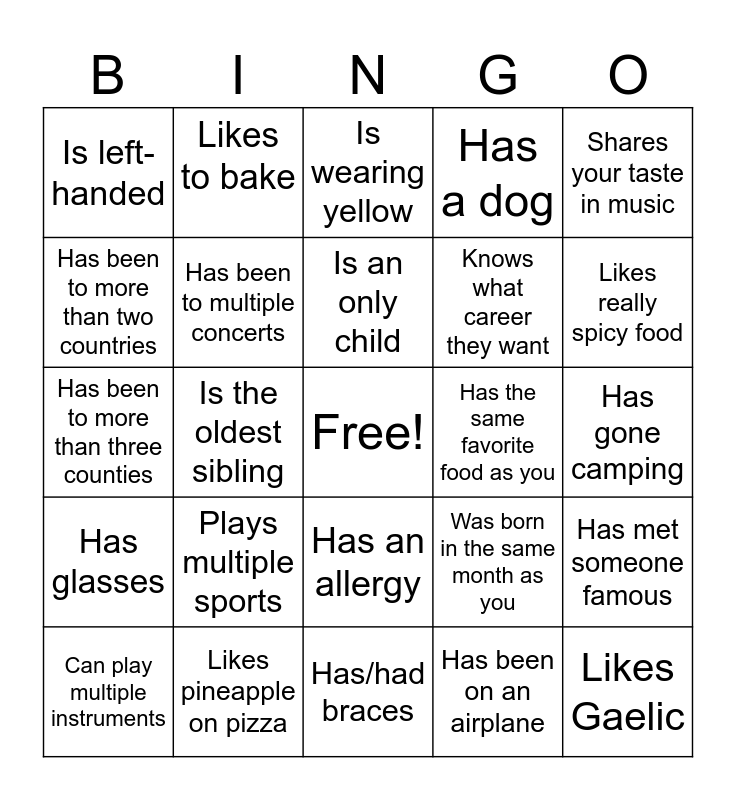 This bingo card has a free space and 24 words: Plays multiple sports, Likes pineapple on pizza, Is an only child, Can play multiple instruments, Shares your taste in music, Is left-handed, Has been to more than two countries, Likes to bake, Has the same favorite food as you, Has an allergy, Knows what career they want, Has been to more than three counties, Was born in the same month as you, Has met someone famous, Has been to multiple concerts, Has been on an airplane, Has gone camping, Is wearing yellow, Likes really spicy food, Is the oldest sibling, Likes Gaelic, Has glasses, Has a dog and Has/had braces.