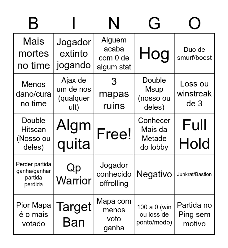 This bingo card has a free space and 24 words: Qp Warrior, Target Ban, 3 mapas ruins, Pior Mapa é o mais votado, Duo de smurf/boost, Mais mortes no time, Menos dano/cura no time, Jogador extinto jogando, Conhecer Mais da Metade do lobby, Jogador conhecido offrolling, Double Msup (nosso ou deles), Double Hitscan (Nosso ou deles), Negativo, Junkrat/Bastion, Ajax de um de nos (qualquer ult), 100 a 0 (win ou loss de ponto/modo), Full Hold, Alguem acaba com 0 de algum stat, Loss ou winstreak de 3, Algm quita, Partida no Ping sem motivo, Perder partida ganha/ganhar partida perdida, Hog and Mapa com menos voto ganha.