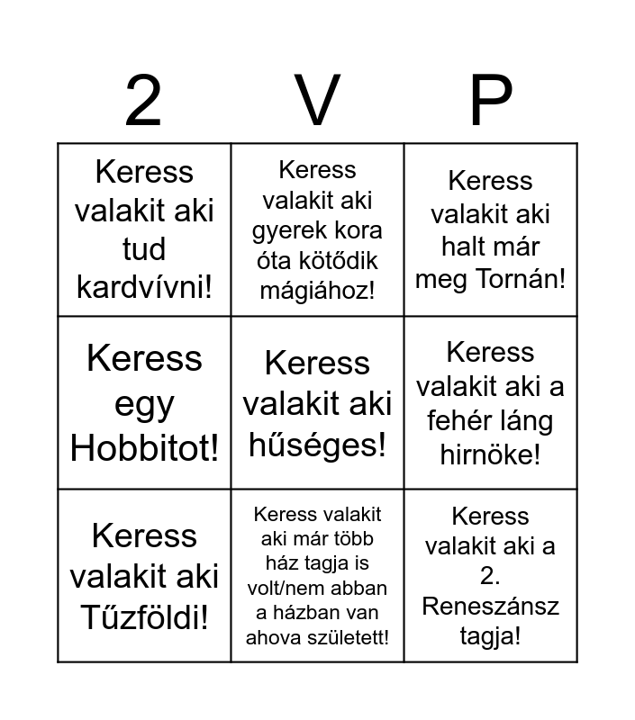 This bingo card has a free space and 8 words: Keress valakit aki a fehér láng hirnöke!, Keress valakit aki halt már meg Tornán!, Keress valakit aki gyerek kora óta kötődik mágiához!, Keress valakit aki Tűzföldi!, Keress valakit aki tud kardvívni!, Keress valakit aki a 2. Reneszánsz tagja!, Keress egy Hobbitot! and Keress valakit aki már több ház tagja is volt/nem abban a házban van ahova született!.