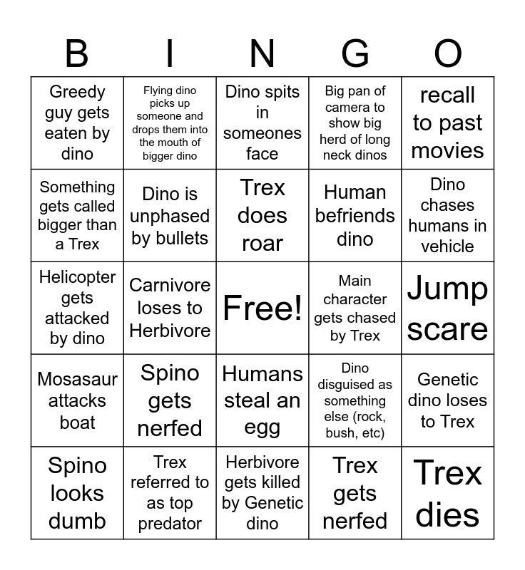 This bingo card has a free space and 24 words: Spino looks dumb, Spino gets nerfed, Trex does roar, Trex gets nerfed, recall to past movies, Greedy guy gets eaten by dino, Flying dino picks up someone and drops them into the mouth of bigger dino, Dino spits in someones face, Main character gets chased by Trex, Jump scare, Helicopter gets attacked by dino, Dino is unphased by bullets, Dino disguised as something else (rock, bush, etc), Genetic dino loses to Trex, Something gets called bigger than a Trex, Trex referred to as top predator, Herbivore gets killed by Genetic dino, Big pan of camera to show big herd of long neck dinos, Dino chases humans in vehicle, Mosasaur attacks boat, Carnivore loses to Herbivore, Humans steal an egg, Human befriends dino and Trex dies.