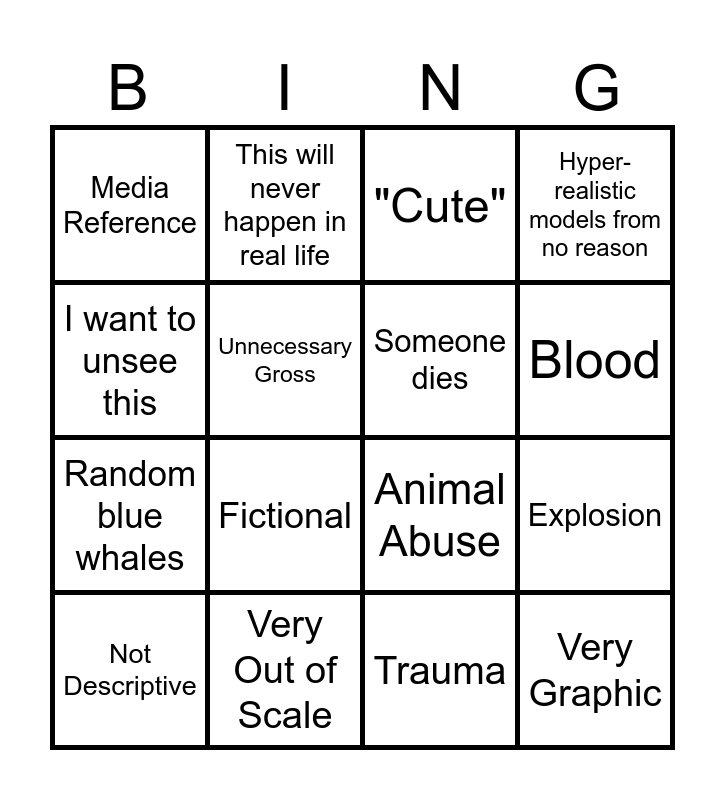 This bingo card has 16 words: Very Out of Scale, Explosion, "Cute", Media Reference, Random blue whales, This will never happen in real life, Animal Abuse, Trauma, I want to unsee this, Unnecessary Gross, Not Descriptive, Hyper-realistic models from no reason, Fictional, Blood, Someone dies and Very Graphic.