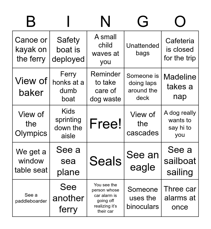 This bingo card has a free space and 35 words: Silver Mercedes car alarm, White Audi car alarm, See an orca, Ferry honks at a dumb boat, Seals, Unattended bags, View of baker, Alex gets a hot chocolate, Reminder to take care of dog waste, Porpoise, View of the Olympics, Cafeteria is closed for the trip, Someone loses a hat, See a group selfie on the deck, Canoe or kayak on the ferry, View of the cascades, Someone uses the binoculars, Kids sprinting down the aisle, We get a window table seat, Three car alarms at once, See an eagle, See a paddleboarder, See a sailboat sailing, See another ferry, A small child waves at you, Madeline takes a nap, Tour bus on the ferry, See a couple doing the titanic pose, Someone is doing laps around the deck, A dog really wants to say hi to you, The ferry departs more than 15 minutes late, You see the person whose car alarm is going off realizing it’s their car, See a sea plane, Safety boat is deployed and Kid says hi to dog.