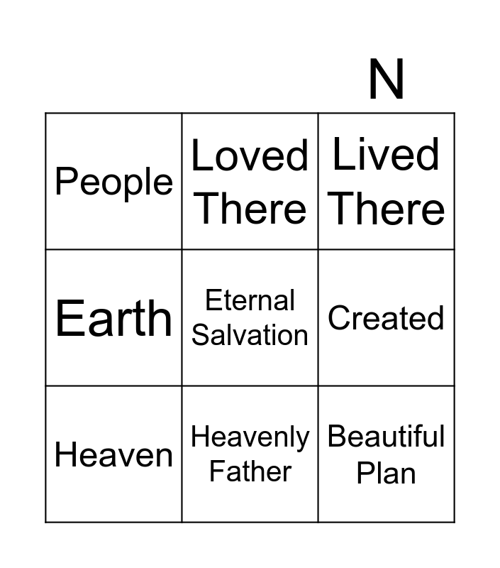 This bingo card has 9 words: Heaven, Lived There, Loved There, Earth, People, Created, Eternal Salvation, Beautiful Plan and Heavenly Father.