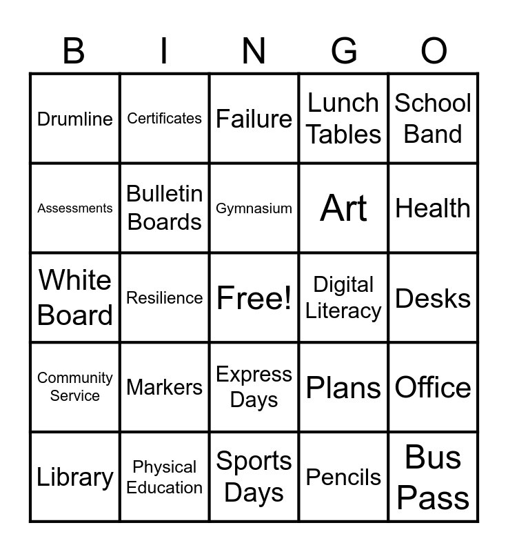 This bingo card has a free space and 97 words: Core Values, Respect, Responsibility, Resilience, Rules, Consequences, Rewards, Principal, Deputy Principal, Security Personnel, Custodian, Care-Taker, Community Partners, Community Service, Cheerleaders, Drumline, School Band, School Choir, School Teams, School Clubs, Bridge Award, Green Steps, Green Tanks, Assembly Hall, Cafeteria, Gymnasium, Library, Office, Folders, Informative Posters, Bulletin Boards, Lunch Tables, Snow Ball Machine, Cotton Candy Machine, Sports Days, Express Days, School Spirit, House Captains, Student Leaders, White Board, Chairs, Desks, Pens, Pencils, Markers, Geometry Set, Ruler, Books, Back Pack, Eraser, Chrome Books, Laptop, Classrooms, Labs, Lockers, LCD Projectors, Sharpener, Certificates, Yearbook, Academic Celebrations, Year Level Outings, Photocopiers, Staff Rooms, School Bus, Flip Charts, Online Programs, English, Math, Science, Physical Education, Art, Music, Social Studies, Business Studies, STEM, French, Spanish, Reading, Digital Literacy, Family Studies, Design & Technology, Health, Senior School Seminar, Intro to Signature Learning, Lockdowns, Fire Drills, Bus Pass, Goals, Dreams, Success, Failure, Life Lessons, Interventions, Plans, Assessments, Instruction and Curriculums.