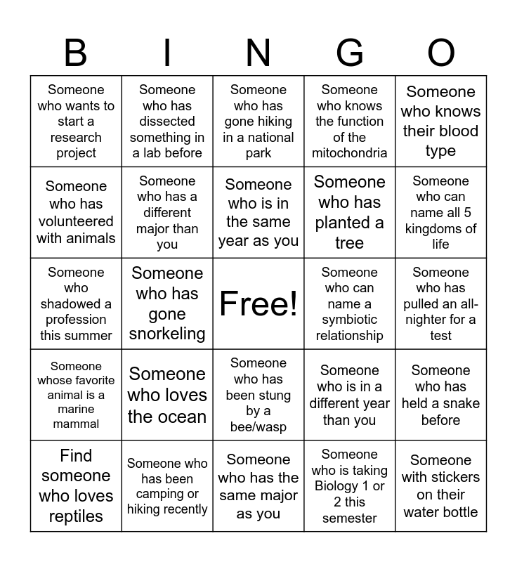 This bingo card has a free space and 24 words: Someone who loves the ocean, Someone who has been camping or hiking recently, Someone who is in the same year as you, Find someone who loves reptiles, Someone who knows their blood type, Someone who wants to start a research project, Someone who has volunteered with animals, Someone who has dissected something in a lab before, Someone who can name a symbiotic relationship, Someone who has been stung by a bee/wasp, Someone who has planted a tree, Someone who shadowed a profession this summer, Someone who is in a different year than you, Someone who has held a snake before, Someone who has a different major than you, Someone who is taking Biology 1 or 2 this semester, Someone who has pulled an all-nighter for a test, Someone who has gone hiking in a national park, Someone who can name all 5 kingdoms of life, Someone who has gone snorkeling, Someone with stickers on their water bottle, Someone whose favorite animal is a marine mammal, Someone who knows the function of the mitochondria and Someone who has the same major as you.