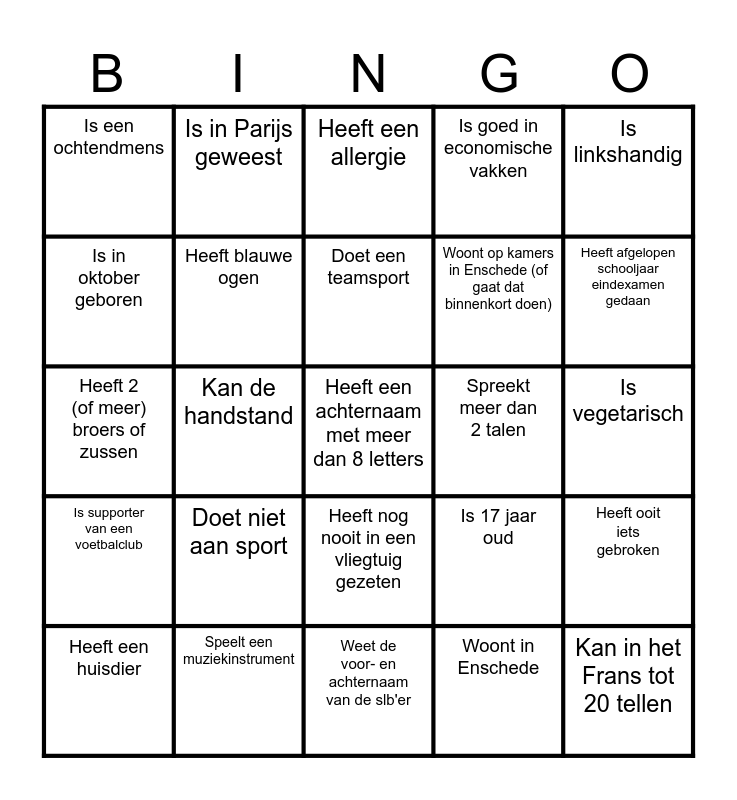 This bingo card has a free space and 24 words: Doet niet aan sport, Speelt een muziekinstrument, Doet een teamsport, Heeft een huisdier, Is linkshandig, Is een ochtendmens, Is in oktober geboren, Is in Parijs geweest, Spreekt meer dan 2 talen, Heeft nog nooit in een vliegtuig gezeten, Woont op kamers in Enschede (of gaat dat binnenkort doen), Heeft 2 (of meer) broers of zussen, Is 17 jaar oud, Heeft ooit iets gebroken, Heeft blauwe ogen, Woont in Enschede, Is vegetarisch, Heeft een allergie, Heeft afgelopen schooljaar eindexamen gedaan, Kan de handstand, Kan in het Frans tot 20 tellen, Is supporter van een voetbalclub, Is goed in economische vakken and Weet de voor- en achternaam van de slb'er.