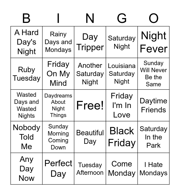 This bingo card has a free space and 50 words: Monday Monday, I Hate Mondays, Blue Monday, Tuesday Afternoon, Sunday Morning Coming Down, Pleasant Valley Sunday, Rainy Days and Mondays, Except for Sunday, Ruby Tuesday, Tuesday's Gone, Friday On My Mind, Saturday Night, Saturday In the Park, Black Friday, Manic Monday, Eight Days a Week, Another Saturday Night, Friday I'm In Love, Saturday Night's Alright, Night Fever, Daydreams About Night Things, Come Monday, A Hard Day's Night, Louisiana Saturday Night, Saturday Night Special, Monday Morning, Sunday Will Never Be the Same, I Met Him On a Sunday, Day Tripper, Beautiful Day, One Fine Day, Sunny Day, Have a Nice Day, Best Day of My Life, Perfect Day, Another Day, Daydream Believer, That'll Be the Day, Day After Day, Daytime Friends, Our Day Will Come, Good Day Sunshine, Another Park Another Sunday, A Sunday Kind of Love, Any Day Now, Wasted Days and Wasted Nights, I Think I'm Going to Like Today, Lovely Day, Nobody Told Me and Those Were the Days.