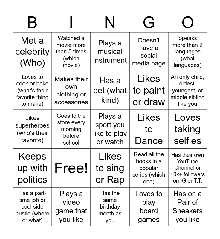 This bingo card has 25 words: Free!, Has the same birthday month as you, Has a pet (what kind), Has a part-time job or cool side hustle (where or what), Speaks more than 2 languages (what languages), Met a celebrity (Who), Loves to cook or bake (what's their favorite thing to make), Watched a movie more than 5 times (which movie), Likes to Dance, Likes to sing or Rap, Likes to paint or draw, Likes superheroes (who's their favorite), Read all the books in a popular series (which one), Has their own YouTube Channel or 10k+ followers on IG or T.T., Makes their own clothing or accessories, Has on a Pair of Sneakers you like, Loves taking selfies, Plays a musical instrument, An only child, oldest, youngest, or middle sibling like you, Goes to the store every morning before school, Plays a sport you like to play or watch, Plays a video game that you like, Keeps up with politics, Doesn't have a social media page and Loves to play board games.