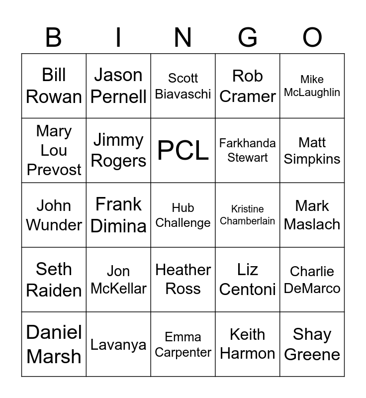 This bingo card has a free space and 24 words: Jon McKellar, Lavanya, PCL, Daniel Marsh, Mike McLaughlin, Bill Rowan, Mary Lou Prevost, Jason Pernell, Kristine Chamberlain, Heather Ross, Farkhanda Stewart, John Wunder, Liz Centoni, Charlie DeMarco, Jimmy Rogers, Keith Harmon, Mark Maslach, Scott Biavaschi, Matt Simpkins, Frank Dimina, Shay Greene, Seth Raiden, Rob Cramer and Emma Carpenter.