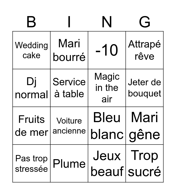 This bingo card has 16 words: Plume, Mari gêne, -10, Wedding cake, Fruits de mer, Mari bourré, Bleu blanc, Jeux beauf, Dj normal, Service à table, Pas trop stressée, Attrapé rêve, Voiture ancienne, Jeter de bouquet, Magic in the air and Trop sucré.