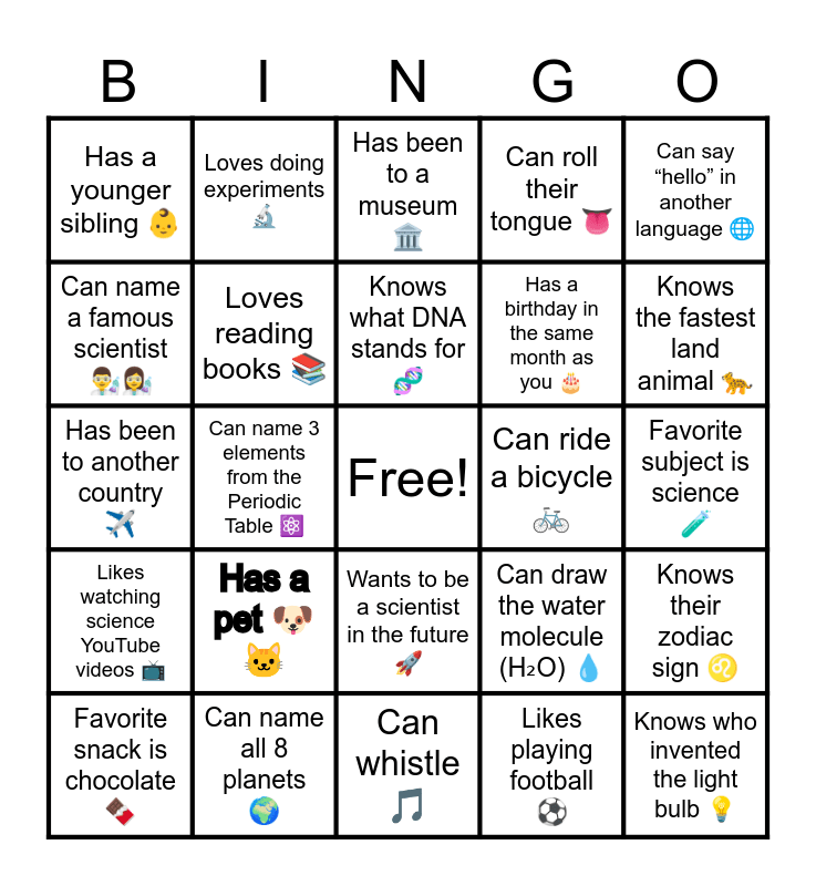 This bingo card has a free space and 24 words: Has a pet πΆπ±, Can name all 8 planets π, Knows what DNA stands for π§¬, Favorite snack is chocolate π«, Can say βhelloβ in another language π, Has a younger sibling πΆ, Can name a famous scientist π¨βπ¬π©βπ¬, Loves doing experiments π¬, Can ride a bicycle π², Wants to be a scientist in the future π, Has a birthday in the same month as you π, Has been to another country βοΈ, Can draw the water molecule (HβO) π§, Knows their zodiac sign β, Loves reading books π, Likes playing football β½, Favorite subject is science π§ͺ, Has been to a museum ποΈ, Knows the fastest land animal π, Can name 3 elements from the Periodic Table βοΈ, Knows who invented the light bulb π‘, Likes watching science YouTube videos πΊ, Can roll their tongue π and Can whistle π΅.