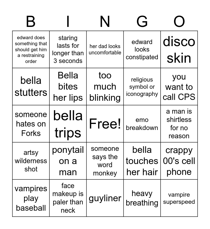 This bingo card has a free space and 26 words: someone says the word monkey, heavy breathing, too much blinking, face makeup is paler than neck, disco skin, edward does something that should get him a restraining order, bella stutters, staring lasts for longer than 3 seconds, a man is shirtless for no reason, bella touches her hair, religious symbol or iconography, someone hates on Forks, crappy 00's cell phone, vampires play baseball, bella trips, closeup of eyes, edward looks constipated, artsy wilderness shot, her dad looks uncomfortable, vampire superspeed, you want to call CPS, guyliner, emo breakdown, ponytail on a man, Bella bites her lips and Trop l’Améwik.