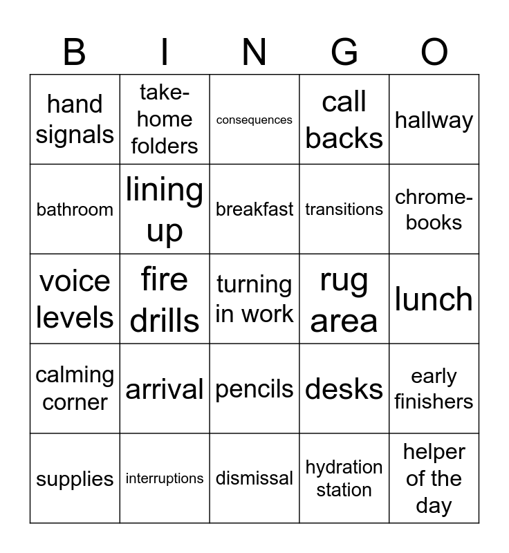 This bingo card has 25 words: arrival, dismissal, breakfast, supplies, hallway, hand signals, bathroom, take-home folders, rug area, pencils, transitions, voice levels, desks, early finishers, lining up, helper of the day, lunch, consequences, chrome- books, fire drills, turning in work, interruptions, calming corner, call backs and hydration station.