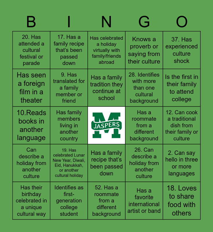 This bingo card has a free space and 118 words: Speaks more than one language, Can say hello in three or more languages, Grew up in a bilingual household, Can teach you a word or phrase in another language, Watches TV shows or movies in another language, Listens to international music, Knows a proverb or saying from their culture, Has taken a language class in college, Has translated for a family member or friend, Reads books in another language, Has a favorite food tied to their heritage, Can cook a traditional dish from their family or culture, Has tried food from 5 or more different countries, Celebrates holidays with special foods, Has tried food from a street vendor in another country, Celebrated a cultural holiday outside of the U.S., Has a family recipe that’s been passed down, Loves to share food with others, Has celebrated Lunar New Year, Diwali, Eid, Hanukkah, or another cultural holiday, Has attended a cultural festival or parade, Has their birthday celebrated in a unique cultural way, Has celebrated a holiday virtually with family/friends abroad, Celebrates Thanksgiving in a non-traditional way, Celebrates New Year’s with a cultural or family tradition, Knows a traditional dance tied to a holiday, Can describe a holiday from another culture, Identifies as first-generation college student, Identifies with more than one cultural background, Has a name with cultural or family significance, Knows a family story passed down through generations, Is the first in their family to attend college, Has a family tradition they continue at school, Has family members living in another country, Has attended a cultural wedding ceremony, Has lived in another country, Has visited more than 3 countries, Has experienced culture shock, Wants to study abroad, Has friends from another country, Has visited a famous landmark outside the U.S., Has traveled by train in another country, Has gone on a road trip that lasted longer than 10 hours, Plays or has played a cultural instrument, Knows a traditional dance or song from their background, Listens to K-pop, reggaeton, Afrobeats, or another global genre, Has seen a live cultural performance (dance, music, theater), Has a favorite international artist or band, Has seen a foreign film in a theater, Knows a cultural folktale or myth, Enjoys international fashion or clothing styles, Is part of a cultural or identity-based student org, Has a roommate from a different background, Has taken a class about culture or diversity, Has attended a campus cultural performance or showcase, Participates in religious/spiritual groups on campus, Has friends from at least 3 different cultural backgrounds, Loves to try new foods from different cultures, Can cook rice at least 3 different ways, Has friends or family who live on another continent, 1. Speaks more than one language, 2. Can say hello in three or more languages, 3. Grew up in a bilingual household, 4. Can teach you a word or phrase in another language, 5. Watches TV shows or movies in another language, 6. Listens to international music, 7. Knows a proverb or saying from their culture, 8. Has taken a language class in college, 9. Has translated for a family member or friend, 10.Reads books in another language, 11. Has a favorite food tied to their heritage, 12. Can cook a traditional dish from their family or culture, 13. Has tried food from 5 or more different countries, 14. Celebrates holidays with special foods, 15. Has tried food from a street vendor in another country, 16. Celebrated a cultural holiday outside of the U.S., 17. Has a family recipe that’s been passed down, 18. Loves to share food with others, 19. Has celebrated Lunar New Year, Diwali, Eid, Hanukkah, or another cultural holiday, 20. Has attended a cultural festival or parade, 21. Has their birthday celebrated in a unique cultural way, 22. Has celebrated a holiday virtually with family/friends abroad, 23. Celebrates Thanksgiving in a non-traditional way, 24. Celebrates New Year’s with a cultural or family tradition, 25. Knows a traditional dance tied to a holiday, 26. Can describe a holiday from another culture, 27. Identifies as first-generation college student, 28. Identifies with more than one cultural background, 29. Has a name with cultural or family significance, 30. Knows a family story passed down through generations, 31. Is the first in their family to attend college, 32. Has a family tradition they continue at school, 33. Has family members living in another country, 34. Has attended a cultural wedding ceremony, 35. Has lived in another country, 36. Has visited more than 3 countries, 37. Has experienced culture shock, 38. Wants to study abroad, 39. Has friends from another country, 40. Has visited a famous landmark outside the U.S., 41. Has traveled by train in another country, 42. Has gone on a road trip that lasted longer than 10 hours, 43. Plays or has played a cultural instrument, 44. Knows a traditional dance or song from their background, 45. Listens to K-pop, reggaeton, Afrobeats, or another global genre, 46. Has seen a live cultural performance (dance, music, theater), 47. Has a favorite international artist or band, 48. Has seen a foreign film in a theater, 49. Knows a cultural folktale or myth, 50. Enjoys international fashion or clothing styles, 51. Is part of a cultural or identity-based student org, 52. Has a roommate from a different background, 53. Has taken a class about culture or diversity, 54. Has attended a campus cultural performance or showcase, 55. Participates in religious/spiritual groups on campus, 56. Has friends from at least 3 different cultural backgrounds, 57. Loves to try new foods from different cultures, 58. Can cook rice at least 3 different ways and 59. Has friends or family who live on another continent.