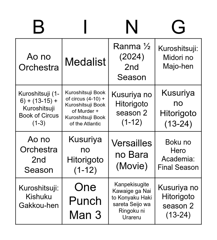 This bingo card has 16 words: One Punch Man 3, Boku no Hero Academia: Final Season, Ranma ½ (2024) 2nd Season, Ao no Orchestra, Ao no Orchestra 2nd Season, Medalist, Versailles no Bara (Movie), Kanpekisugite Kawaige ga Nai to Konyaku Haki sareta Seijo wa Ringoku ni Urareru, Kuroshitsuji (1-6) + (13-15) + Kuroshitsuji Book of Circus (1-3), Kuroshitsuji Book of circus (4-10) + Kuroshitsuji Book of Murder + Kuroshitsuji Book of the Atlantic, Kuroshitsuji: Kishuku Gakkou-hen, Kuroshitsuji: Midori no Majo-hen, Kusuriya no Hitorigoto (1-12), Kusuriya no Hitorigoto (13-24), Kusuriya no Hitorigoto season 2 (1-12) and Kusuriya no Hitorigoto season 2 (13-24).