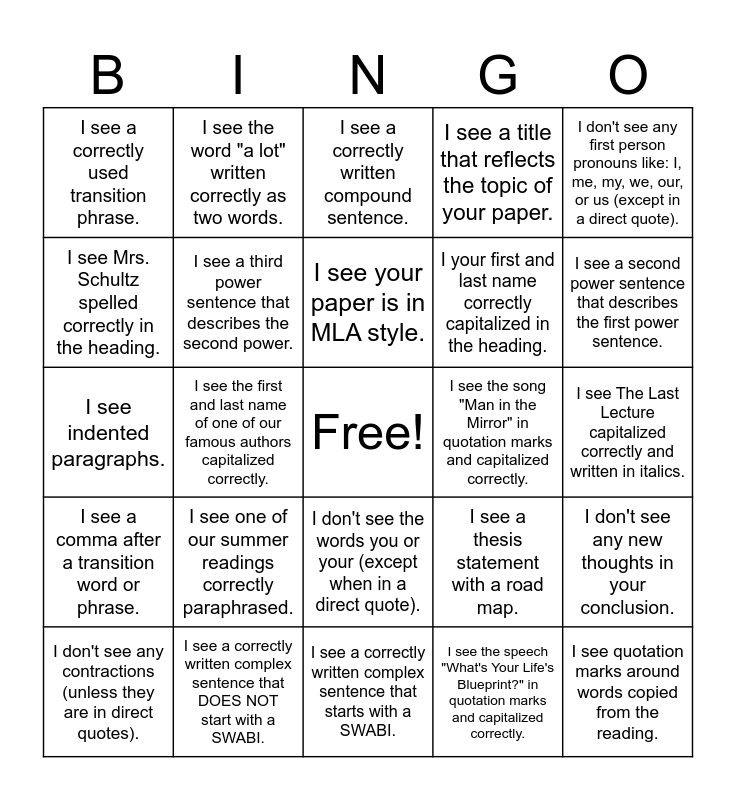 This bingo card has a free space and 31 words: I see a correctly written complex sentence that starts with a SWABI., I see a correctly used semi colon., I see the first and last name of one of our famous authors capitalized correctly., I see a capitalized proper noun., I see a correctly used transition phrase., I see a correctly written compound sentence., I see a third power sentence that describes the second power., I see a thesis statement with a road map., I see the song "Man in the Mirror" in quotation marks and capitalized correctly., I see the speech "What's Your Life's Blueprint?" in quotation marks and capitalized correctly., I see The Last Lecture capitalized correctly and written in italics., I see quotation marks around words copied from the reading., I see an attention grabber that relates to the N section of the essay., I see a FANBOYS conjunction correctly written in a simple sentence., I see a second power sentence that describes the first power sentence., I see the speech "If You Want to Change the World, Make Your Bed" capitalized correctly and in quotation marks., I don't see any new thoughts in your conclusion., I see one of our summer readings correctly paraphrased., I see a comma after a transition word or phrase., I don't see the words you or your (except when in a direct quote)., I don't see any first person pronouns like: I, me, my, we, our, or us (except in a direct quote)., I see an apostrophe used correctly to show possession., I don't see any contractions (unless they are in direct quotes)., I see the word "a lot" written correctly as two words., I your first and last name correctly capitalized in the heading., I see Mrs. Schultz spelled correctly in the heading., I see a title that reflects the topic of your paper., I see indented paragraphs., I see a correctly written complex sentence that DOES NOT start with a SWABI., I see your paper is in MLA style. and I see a simple sentence with a list separated by commas..