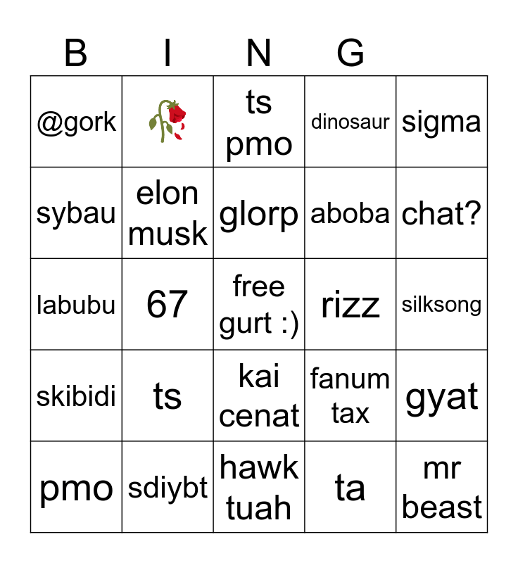 This bingo card has a free space and 24 words: ts, sdiybt, glorp, pmo, sigma, @gork, sybau, 🥀, rizz, kai cenat, aboba, labubu, fanum tax, gyat, elon musk, ta, silksong, ts pmo, chat?, 67, mr beast, skibidi, dinosaur and hawk tuah.
