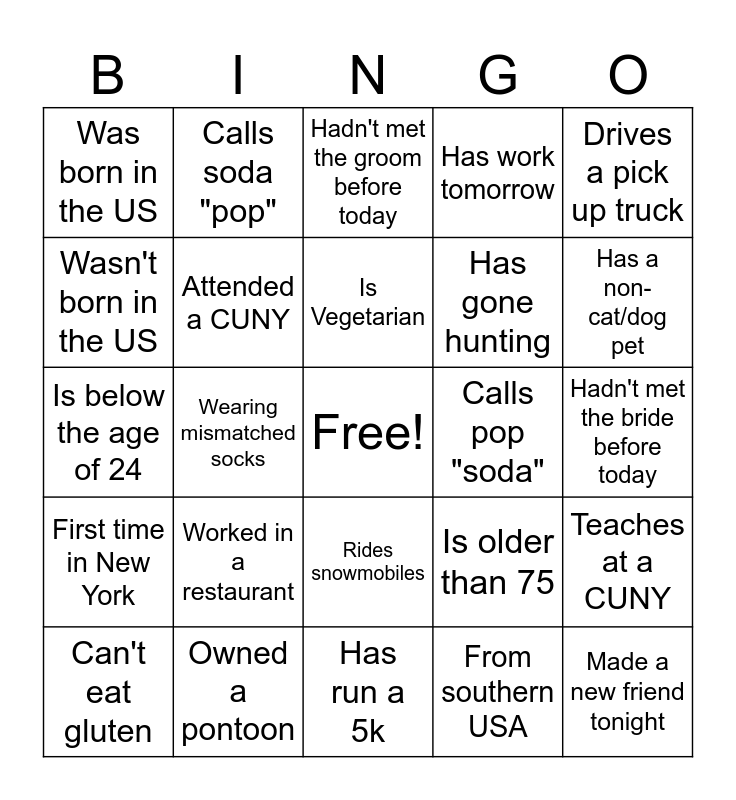 This bingo card has a free space and 24 words: Worked in a restaurant, Owned a pontoon, Is Vegetarian, Can't eat gluten, Drives a pick up truck, Was born in the US, Wasn't born in the US, Calls soda "pop", Calls pop "soda", Rides snowmobiles, Has gone hunting, Is below the age of 24, Is older than 75, Teaches at a CUNY, Attended a CUNY, From southern USA, Hadn't met the bride before today, Hadn't met the groom before today, Has a non-cat/dog pet, Wearing mismatched socks, Made a new friend tonight, First time in New York, Has work tomorrow and Has run a 5k.