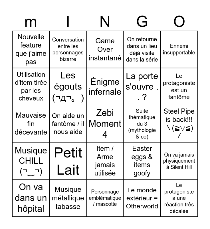 This bingo card has a free space and 24 words: Petit Lait, Musique métallique tabasse, Énigme infernale, On va dans un hôpital, Ennemi insupportable, Nouvelle feature que j'aime pas, Utilisation d'item tirée par les cheveux, Conversation entre les personnages bizarre, Suite thématique du 3 (mythologie & co), Item / Arme jamais utilisée, La porte s'ouvre . . ?, Mauvaise fin décevante, Easter eggs & items goofy, On va jamais physiquement à Silent Hill, Les égouts (¬д¬。), Le monde extérieur = Otherworld, Steel Pipe is back!!! \(≧▽≦)/, Game Over instantané, Le protagoniste est un fantôme, On aide un fantôme / il nous aide, Le protagoniste a une réaction très décalée, Musique CHILL (¬‿¬), On retourne dans un lieu déjà visité dans la série and Personnage emblématique / mascotte.