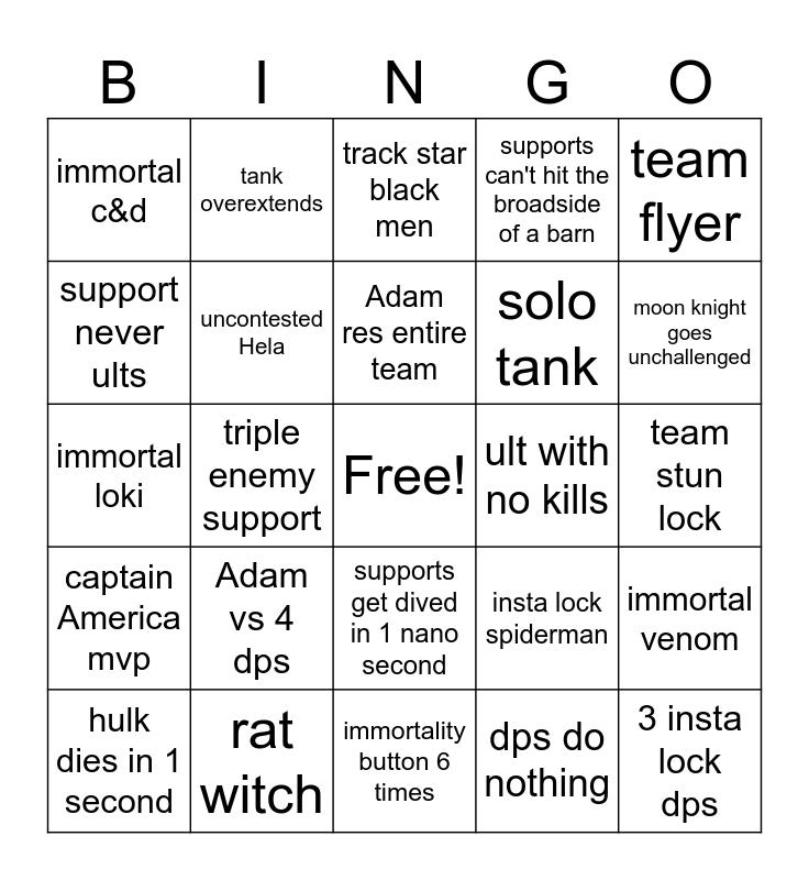 This bingo card has a free space and 24 words: Adam vs 4 dps, rat witch, Adam res entire team, hulk dies in 1 second, team flyer, immortal c&d, support never ults, tank overextends, ult with no kills, supports get dived in 1 nano second, solo tank, immortal loki, insta lock spiderman, immortal venom, uncontested Hela, dps do nothing, team stun lock, track star black men, moon knight goes unchallenged, triple enemy support, 3 insta lock dps, captain America mvp, supports can't hit the broadside of a barn and immortality button 6 times.