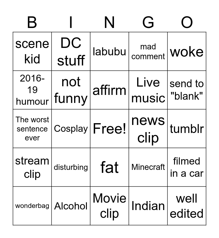 This bingo card has a free space and 106 words: podcast, Hatsune miku, woke, anti-woke, dreamsmp, animal crossing song, lesbian, furry, Nintendo rage bait, sonic, weird food, street interview, AI, Korean, OF promo, dead meme, labubu, twitter screenshot, grok, disabled, fat, funny, cringe, TikTok reupload, reddit, disturbing, send to "blank", mad comment, life hack, muscular black man, Minecraft, Indian, poorly edited, reaction, old man, feet, poorly hidden fetish, pregnancy, affirm, sped up clip, explosion, fnaf, war, stream clip, clip farming, 2016-19 humour, Goth Girl, scene kid, early 00s nostalgia, well edited, well shot, Alcohol, Drugs, LGBT, Fake Prank, “challenge”, brainrot, Minecraft, Lego, DC stuff, Kojima, Weird Animal, doctor who, Tommyinnit, Guitar tips, femboy, performative male, Reel that annoys Cameron, Live music, The worst sentence ever, Cosplay, Movie clip, TV clip, edit, Slur, home décor, "99% accurate", film interview, film bts, Beatles, Israel, Someone dies, millennial, smosh, star wars, technology, news clip, cigarette, Ozzy Osborne, takes too long to get to the point, fallout, beyond help, neet, bad phone quality, paedophile, filmed in a car, impression, "ive seen this before", Actual talent, tumblr, not funny, looks like Freddie, john cena, "clanker", wonderbag and calls one of us out.