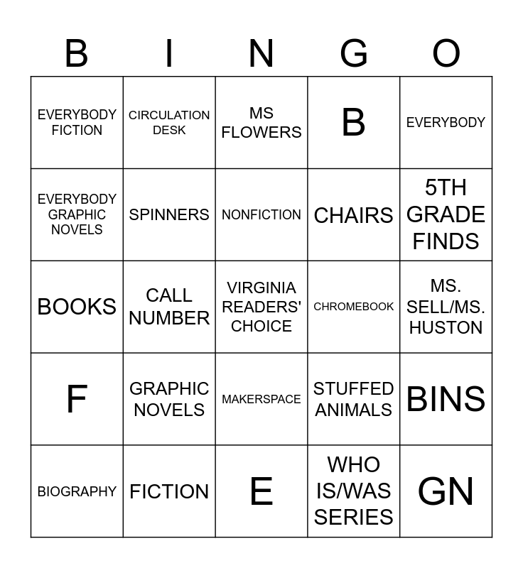 This bingo card has a free space and 24 words: GRAPHIC NOVELS, FICTION, NONFICTION, BIOGRAPHY, EVERYBODY, EVERYBODY FICTION, EVERYBODY GRAPHIC NOVELS, CIRCULATION DESK, CHROMEBOOK, MAKERSPACE, CHAIRS, BOOKS, STUFFED ANIMALS, BINS, SPINNERS, WHO IS/WAS SERIES, MS. SELL/MS. HUSTON, MS FLOWERS, 5TH GRADE FINDS, CALL NUMBER, GN, F, B and E.