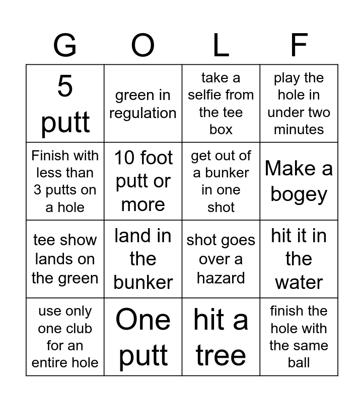 This bingo card has 25 words: Free!, Make a par, Make a bogey, Worse than a bogie, Finish with less than 3 putts on a hole, 5 putt, 10 foot putt or more, green in regulation, One putt, hit a fairway, tee show lands on the green, shot goes over a hazard, hit a ball out of bounds, chip over the green, get out of a bunker in one shot, give a teammate a high five, hit a tree, take a selfie from the tee box, land in the bunker, hit it in the water, use only one club for an entire hole, everyone hits the green on a par three, finish the hole with the same ball, play the hole in under two minutes and make putt without the putter.