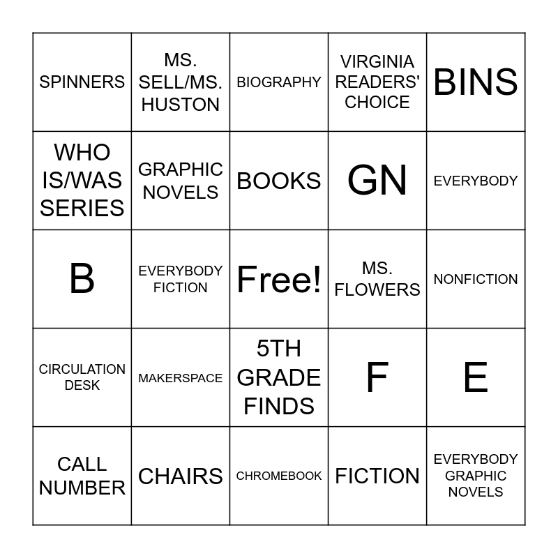This bingo card has a free space and 24 words: MAKERSPACE, CHAIRS, BOOKS, CALL NUMBER, BINS, SPINNERS, WHO IS/WAS SERIES, MS. SELL/MS. HUSTON, MS. FLOWERS, 5TH GRADE FINDS, GN, B, F, E, GRAPHIC NOVELS, FICTION, NONFICTION, BIOGRAPHY, EVERYBODY, EVERYBODY FICTION, EVERYBODY GRAPHIC NOVELS, CIRCULATION DESK, VIRGINIA READERS' CHOICE and CHROMEBOOK.