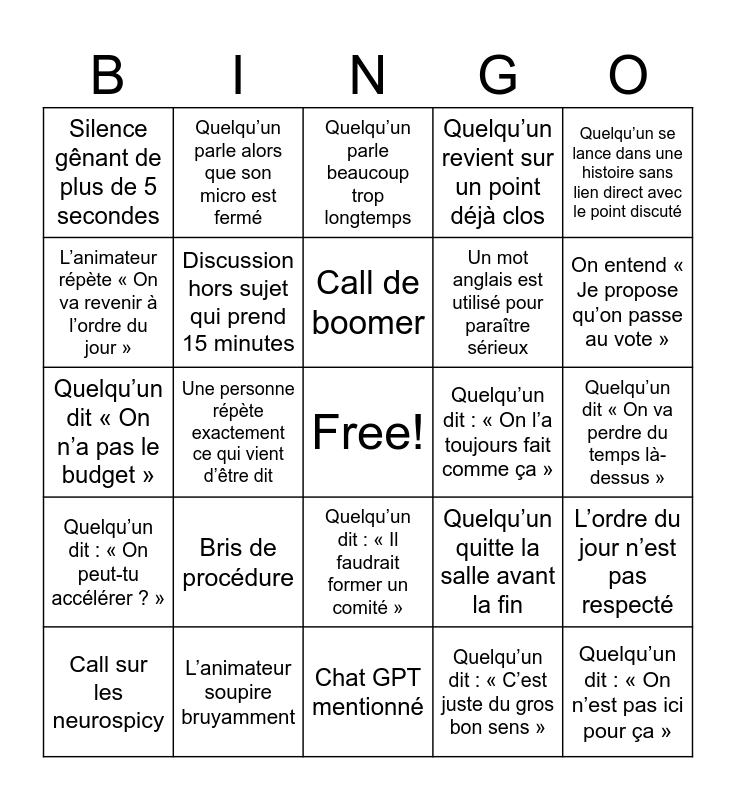 This bingo card has a free space and 25 words: Bris de procédure, Chat GPT mentionné, Call de boomer, Call sur les neurospicy, Quelqu’un se lance dans une histoire sans lien direct avec le point discuté, Silence gênant de plus de 5 secondes, L’animateur répète « On va revenir à l’ordre du jour », Quelqu’un parle alors que son micro est fermé, Quelqu’un dit : « On l’a toujours fait comme ça », Quelqu’un dit : « Il faudrait former un comité », Un mot anglais est utilisé pour paraître sérieux, Quelqu’un dit « On n’a pas le budget », Quelqu’un quitte la salle avant la fin, L’ordre du jour n’est pas respecté, Discussion hors sujet qui prend 15 minutes, Quelqu’un fait une blague qui ne pogne pas, Quelqu’un dit « On va perdre du temps là-dessus », Quelqu’un parle beaucoup trop longtemps, On entend « Je propose qu’on passe au vote », Une personne répète exactement ce qui vient d’être dit, Quelqu’un dit : « On n’est pas ici pour ça », L’animateur soupire bruyamment, Quelqu’un dit : « On peut-tu accélérer ? », Quelqu’un revient sur un point déjà clos and Quelqu’un dit : « C’est juste du gros bon sens ».