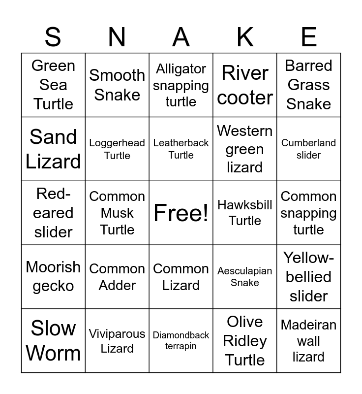 This bingo card has a free space and 24 words: Common Adder, Viviparous Lizard, Leatherback Turtle, Slow Worm, Barred Grass Snake, Green Sea Turtle, Sand Lizard, Smooth Snake, Hawksbill Turtle, Common Lizard, Western green lizard, Red-eared slider, Aesculapian Snake, Yellow-bellied slider, Loggerhead Turtle, Olive Ridley Turtle, Common snapping turtle, Alligator snapping turtle, Cumberland slider, Common Musk Turtle, Madeiran wall lizard, Moorish gecko, River cooter and Diamondback terrapin.