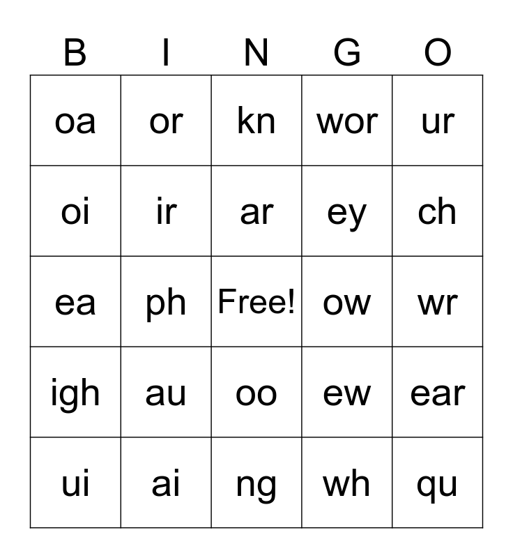 This bingo card has a free space and 24 words: au, ai, ar, ui, ur, oa, oi, or, ow, oo, ey, ea, ew, ear, ir, wh, wr, kn, ch, ph, qu, igh, wor and ng.