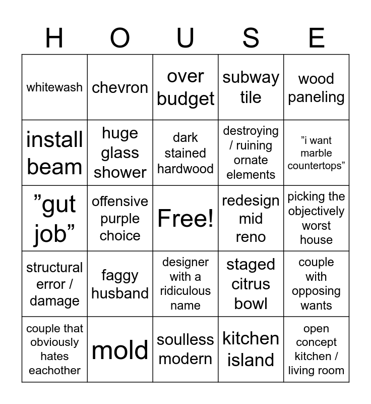 This bingo card has a free space and 24 words: faggy husband, mold, dark stained hardwood, couple that obviously hates eachother, wood paneling, whitewash, install beam, chevron, redesign mid reno, designer with a ridiculous name, destroying / ruining ornate elements, ”gut job”, staged citrus bowl, couple with opposing wants, huge glass shower, kitchen island, picking the objectively worst house, over budget, ”i want marble countertops”, offensive purple choice, open concept kitchen / living room, structural error / damage, subway tile and soulless modern.