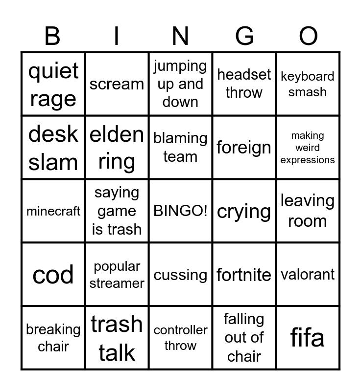 This bingo card has a free space and 24 words: popular streamer, trash talk, blaming team, breaking chair, keyboard smash, quiet rage, desk slam, scream, crying, cussing, foreign, minecraft, fortnite, valorant, elden ring, falling out of chair, leaving room, jumping up and down, making weird expressions, saying game is trash, fifa, cod, headset throw and controller throw.