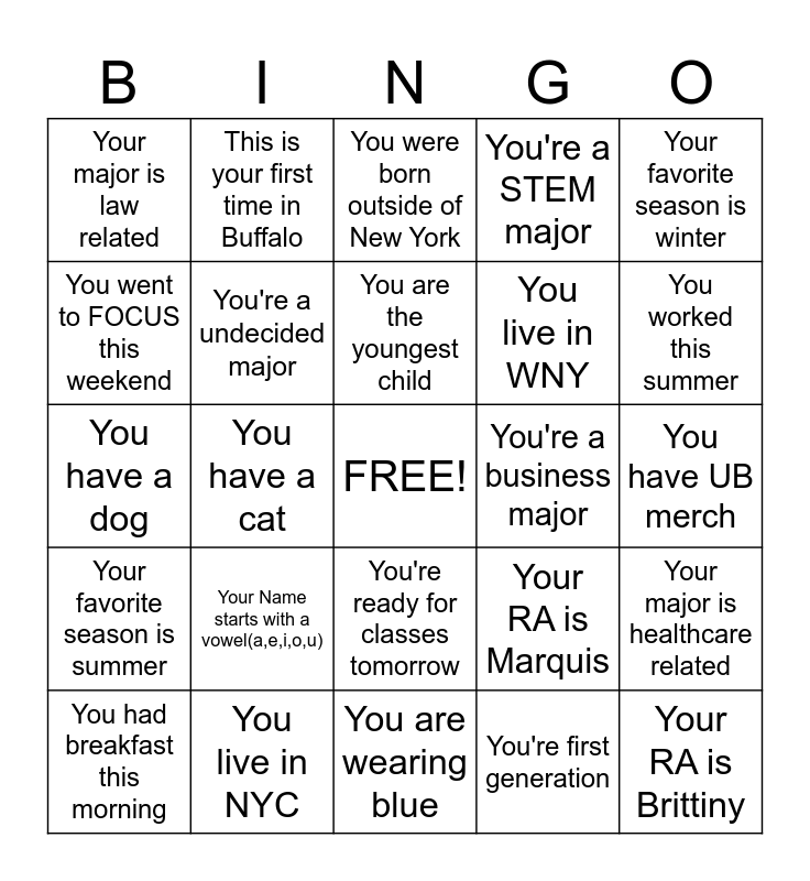 This bingo card has a free space and 24 words: Your Name starts with a vowel(a,e,i,o,u), You live in NYC, You are the youngest child, You had breakfast this morning, Your favorite season is winter, Your major is law related, You went to FOCUS this weekend, This is your first time in Buffalo, You're a business major, You're ready for classes tomorrow, You live in WNY, You have a dog, Your RA is Marquis, Your major is healthcare related, You're a undecided major, You're first generation, You have UB merch, You were born outside of New York, You worked this summer, You have a cat, Your RA is Brittiny, Your favorite season is summer, You're a STEM major and You are wearing blue.